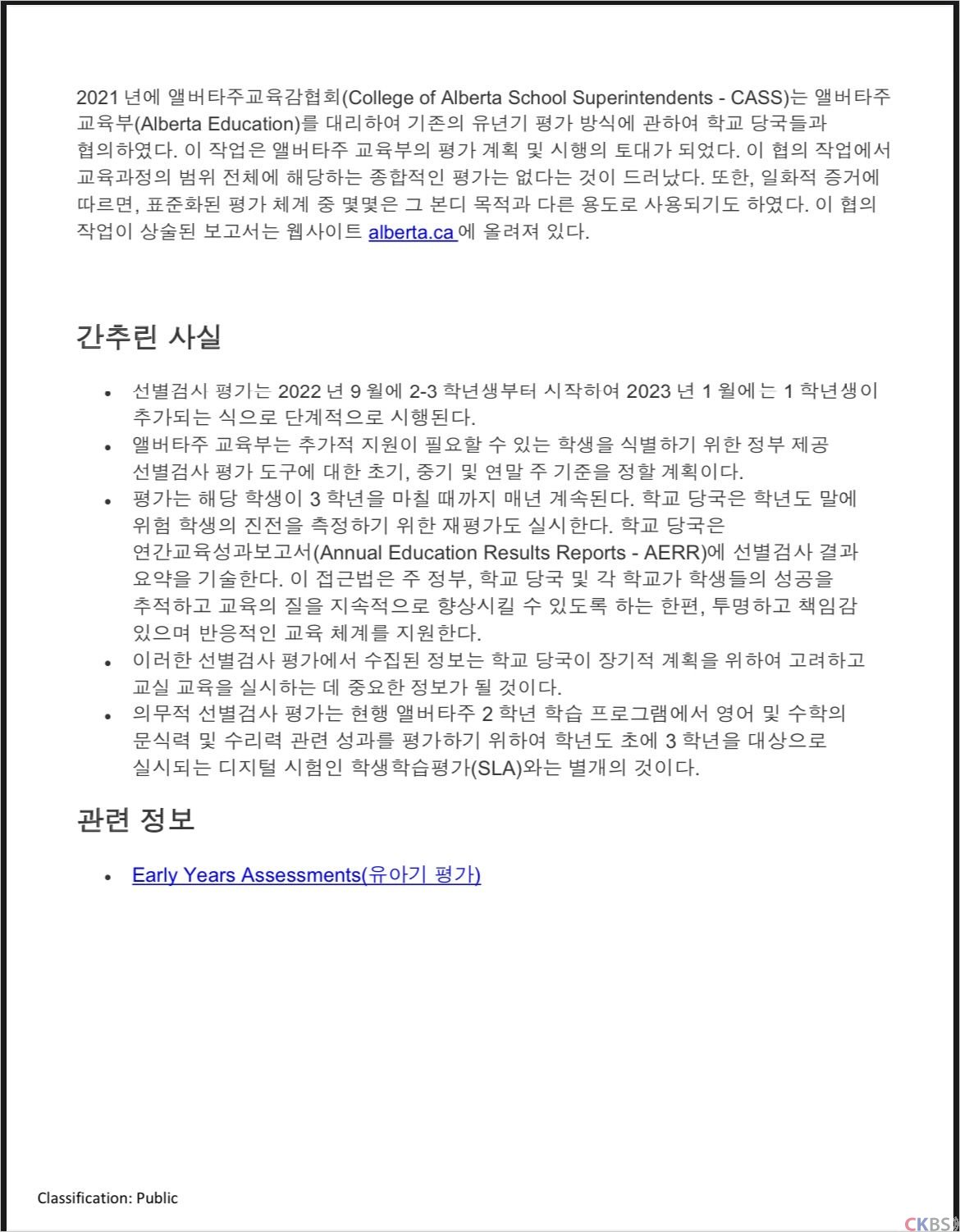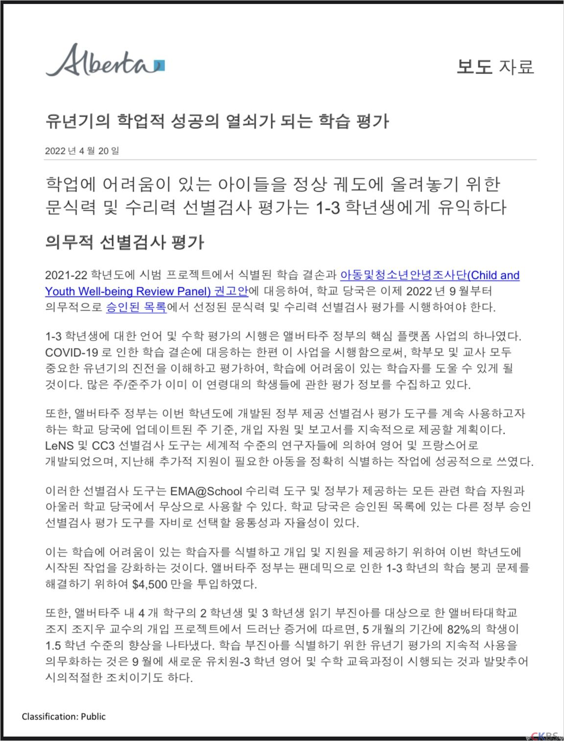 주정부 보도자료-유년기의 학업적 성공의 열쇠가 되는 학습 평가